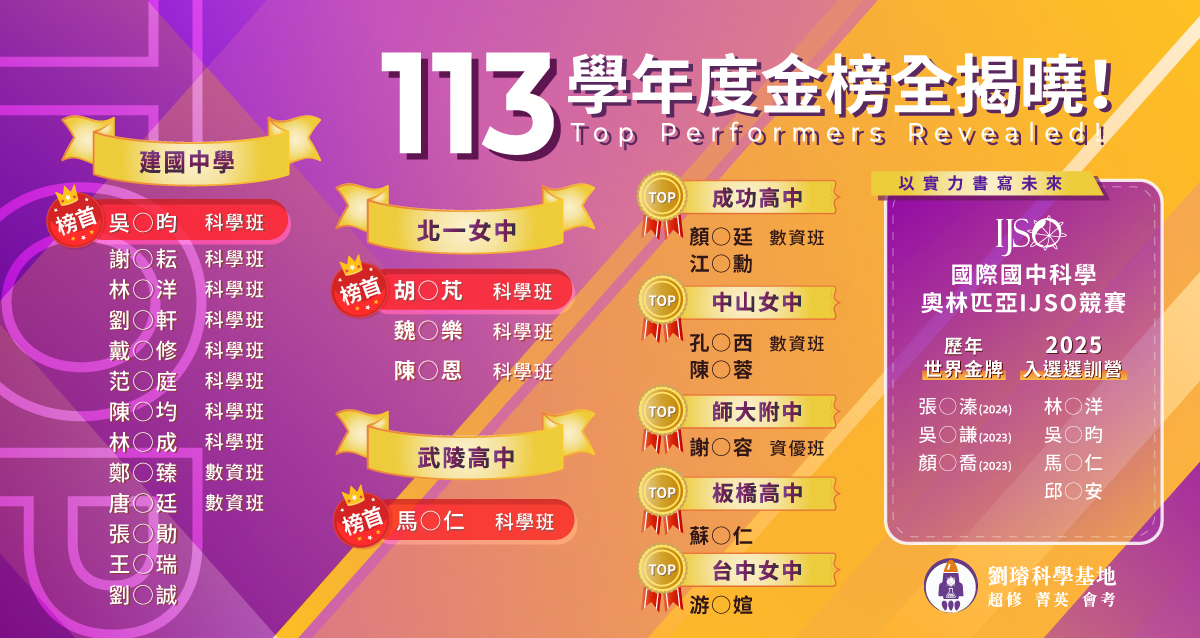 此次榜單涵蓋多位同學進入建中、北一女、成功中學等頂尖高中科學班、數資班,更有優秀學子代表參與國際科學奧林匹亞選訓並獲得全台僅6位的世界金牌!